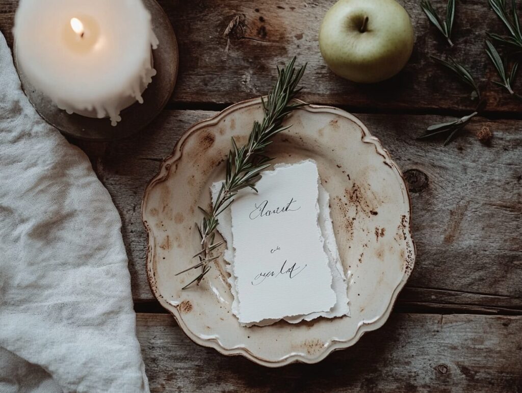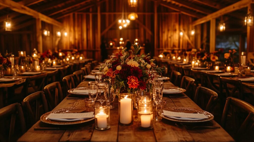 Tables were farm tables — no linens, just the warm patina of old wood. Place settings were simple: cream ceramic plates, hand-torn name cards in walnut ink, and a sprig of rosemary at each seat. Candles everywhere — pillar candles on the tables, votives lining the aisle, lanterns hung from the barn beams. By the time the sun went down, the barn glowed.